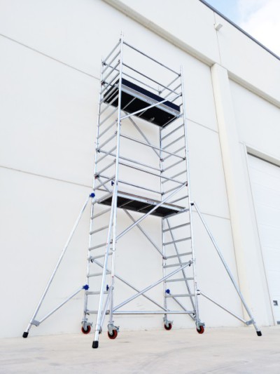 Torre de Andaime composta por liga leve de alumínio tubular com 42mm de diâmetro. Facilmente transportável, devido à leveza das peças componentes. Montagem simples em poucos minutos.